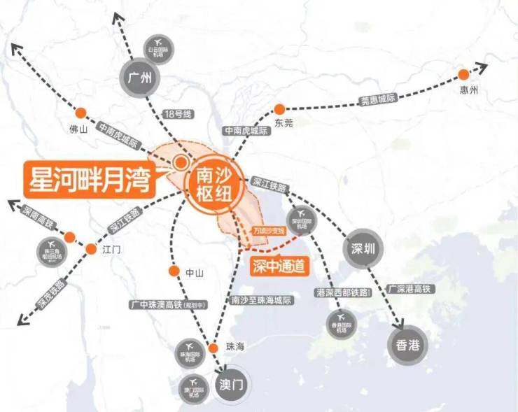 南沙区作为粤港澳大湾区核心枢纽,具备国家级新区、自贸区、广州副中心等多重战略定位,发展潜力巨大。星河·畔月湾所在的万顷沙板块,与横沥岛仅隔一江之距,共享广州地铁18号线的发展红利。未来,横沥岛规划成熟后,将直接带动周边房价上升。此外,项目紧邻南沙枢纽TOD站,未来将建成14站30线的超级轨道交通枢纽,站台规模仅次于广州南站,交通便利性进一步提升。