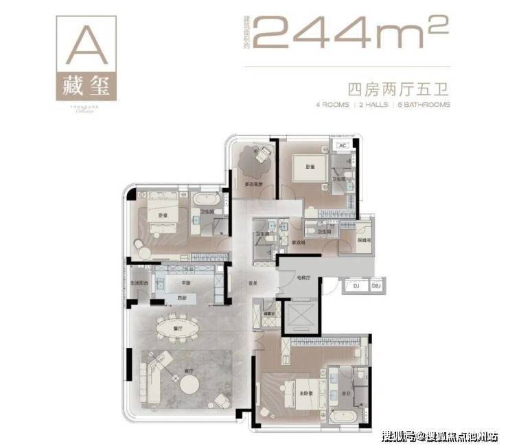 建面约244㎡四房五卫两厅户型,是由四个套房+一个公卫组成。在四个套房中,有一个是保姆套房。