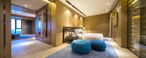 大主卧室整体简约明快又讲究细节的丰富性,以灰蓝为主色调,犹如睡在星空倒映于湖水中!恰到好处的布置设计,缔造优雅写意空间,让身躯得以舒适休息。