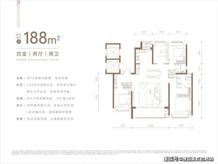 该户型南北通透,三开间朝南,客厅约6.6米的超大开间与“跑道式”阳台,南向约14米大面宽,武汉天地同款入户装甲门,室内空间感拉满;