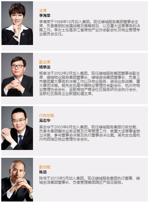 高管变动之前,在绿城服务的官网和董事会介绍中,一共有4位核心高管,董事会主席李海荣、董事会副主席杨掌法、执行总裁吴志华,以及副总裁陈浩。