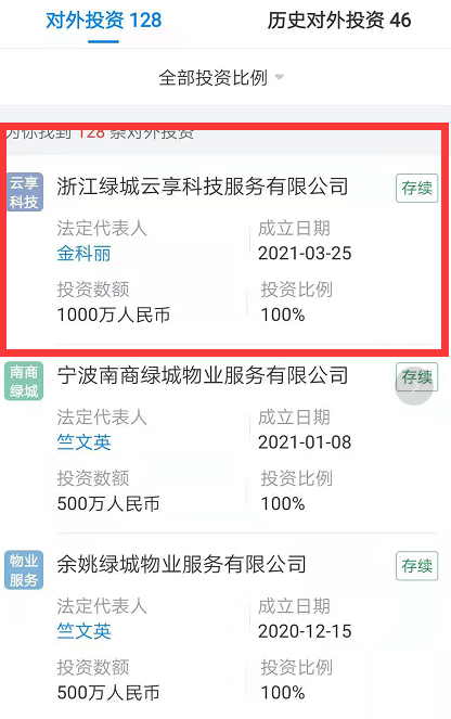 此外,焦点财经发现,绿城服务曾在今年3月新增对外投资浙江绿城云享科技服务有限公司,投资金额1000万人民币,而该公司的法定代表人正是新任执行总裁金科丽。