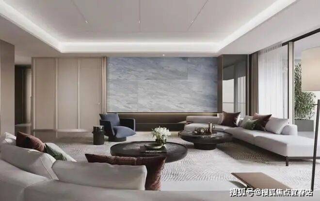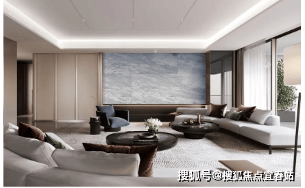 不仅厨房如此,客厅的用材也是诚意十足:土耳其进口的地面石材、巴西进口的奢石背景墙、意大利进口的蓝金沙奢石玄关对景,还有皮革墙面……气质拿捏十分到位。