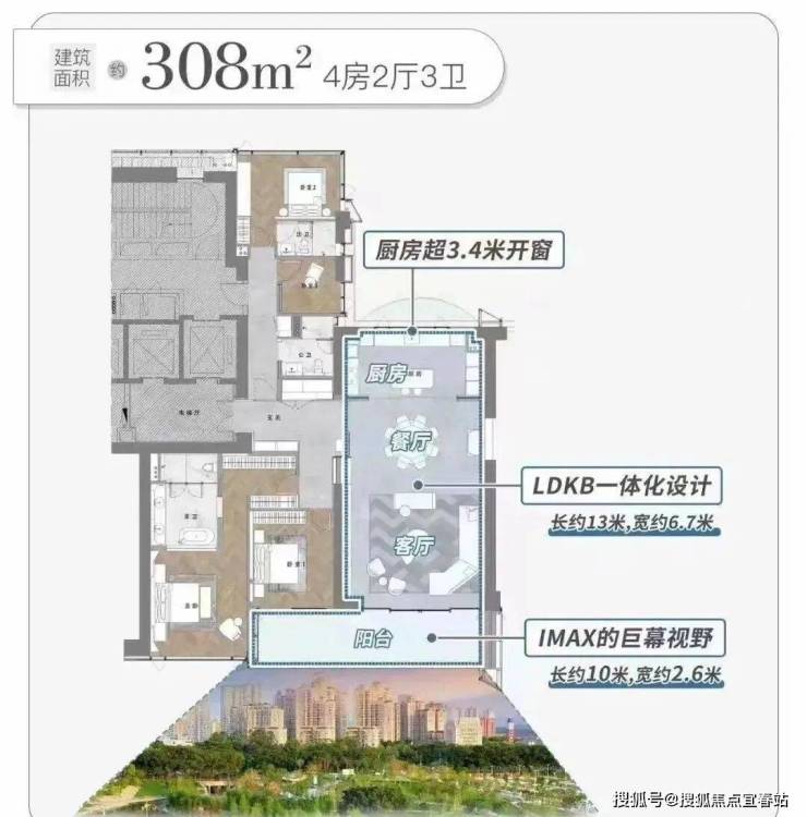 转角阳台设计,使客厅实现270°IMAX景观视野,可享多重景观视野。楼下绿意盎然的中心公园、未来附近林立的CBD高楼、远处的城市和山脉风光……一览无余。