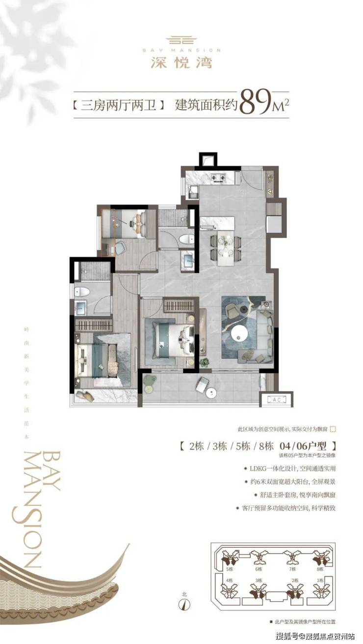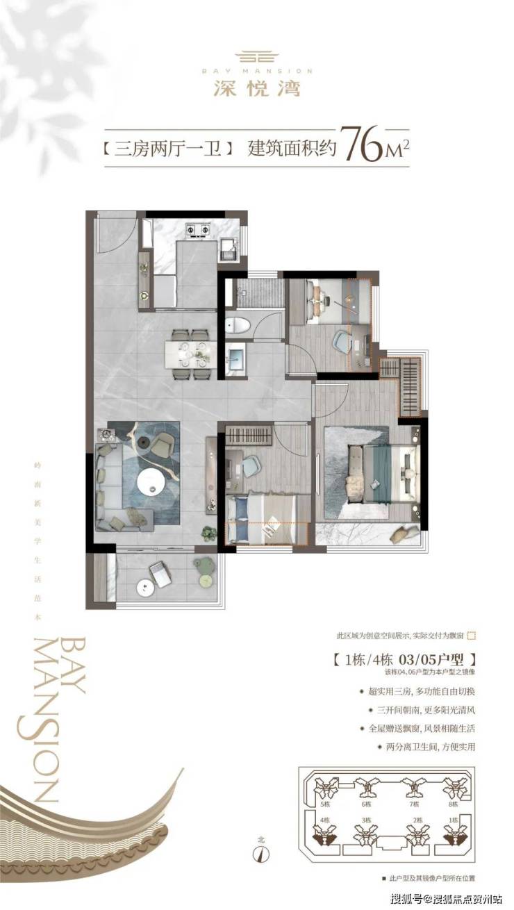 客餐厅采用LDKG一体化布局,进深高达约10.4米,尺度感瞬间拉满。客厅外接南向双开间阳台,约6.2m的采光面,为室内引入更多清风暖阳。全南向三房设计,每一位家人都能享受阳光的宠爱。室室飘窗,推窗即揽无边岭南园景。