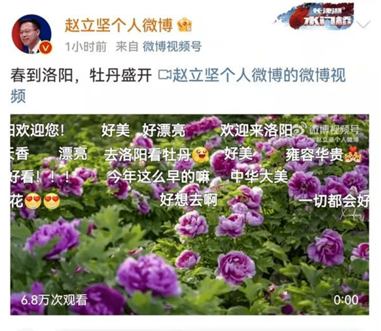 “唯有牡丹真国色,花开时节动京城。”有“牡丹花都”之称的洛阳,也迎来了牡丹盛放的季节。3月19日,外交部新闻发言人赵立坚在个人微博发布了一段10秒的洛阳牡丹视频,并配文“春到洛阳,牡丹盛开”,点赞超1.7万次,世界各地的网友纷纷跟评称赞。大V的发声对旅游城市名片的传播不失为一种高效的带动。