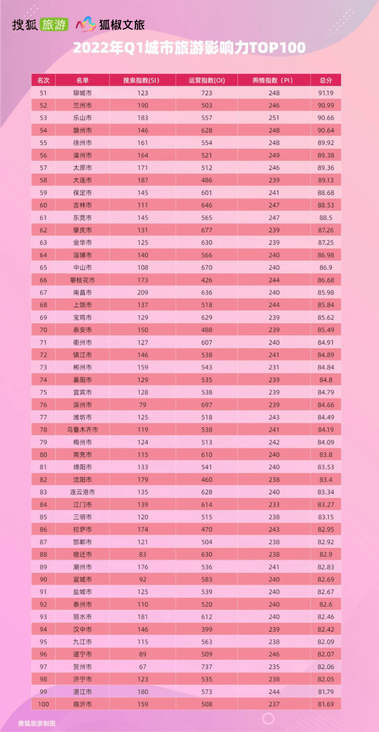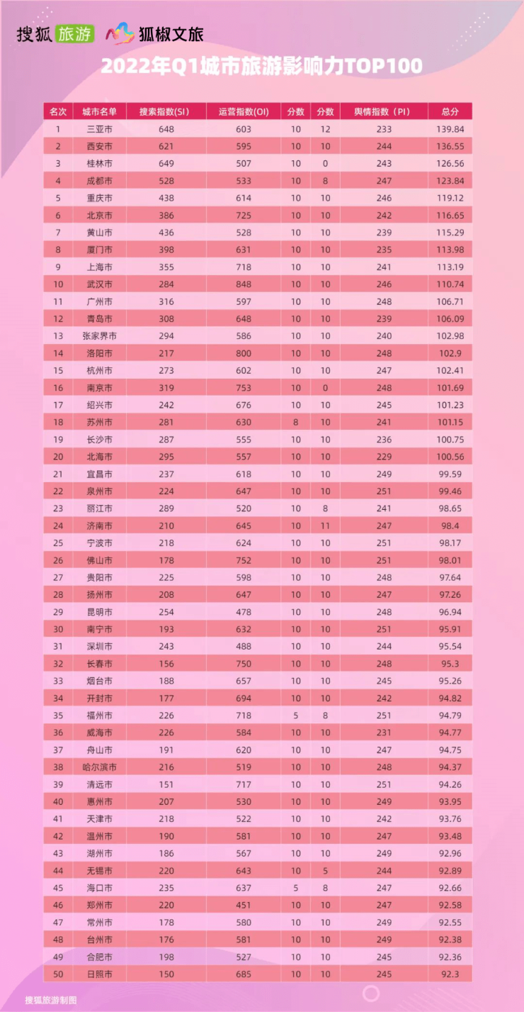 继县域旅游影响力报告之后,搜狐旅游、狐椒文旅联合推出2022年一季度全国旅游城市品牌影响力报告!