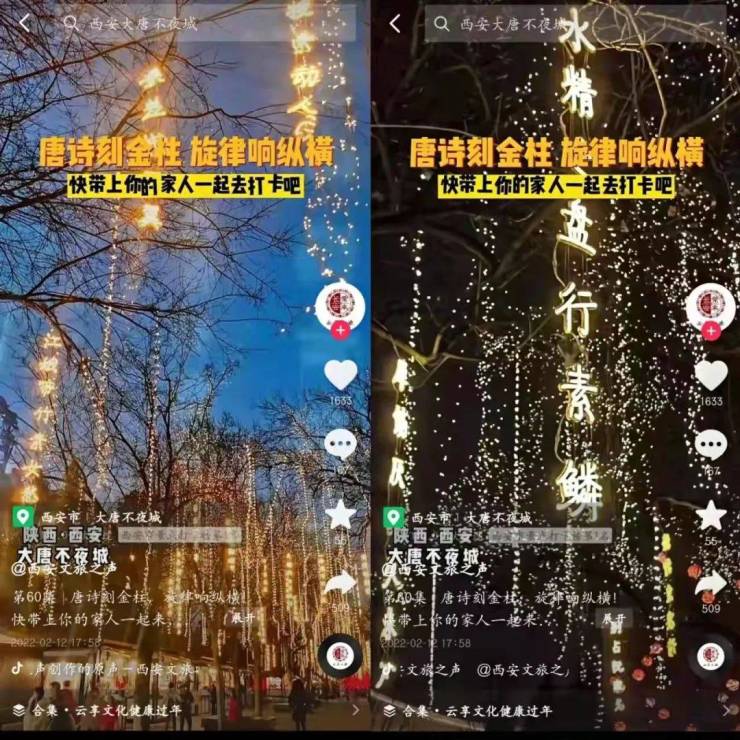 作为西安夜经济的“顶流”大唐不夜城,春节期间推出了限定版灯光景观唐诗刻金柱,在唯美浪漫的氛围里展示着浓郁的唐风唐韵。2至3月,央视网多次通过慢直播镜头,带领观众们云游钟楼感受绚丽的不夜城。