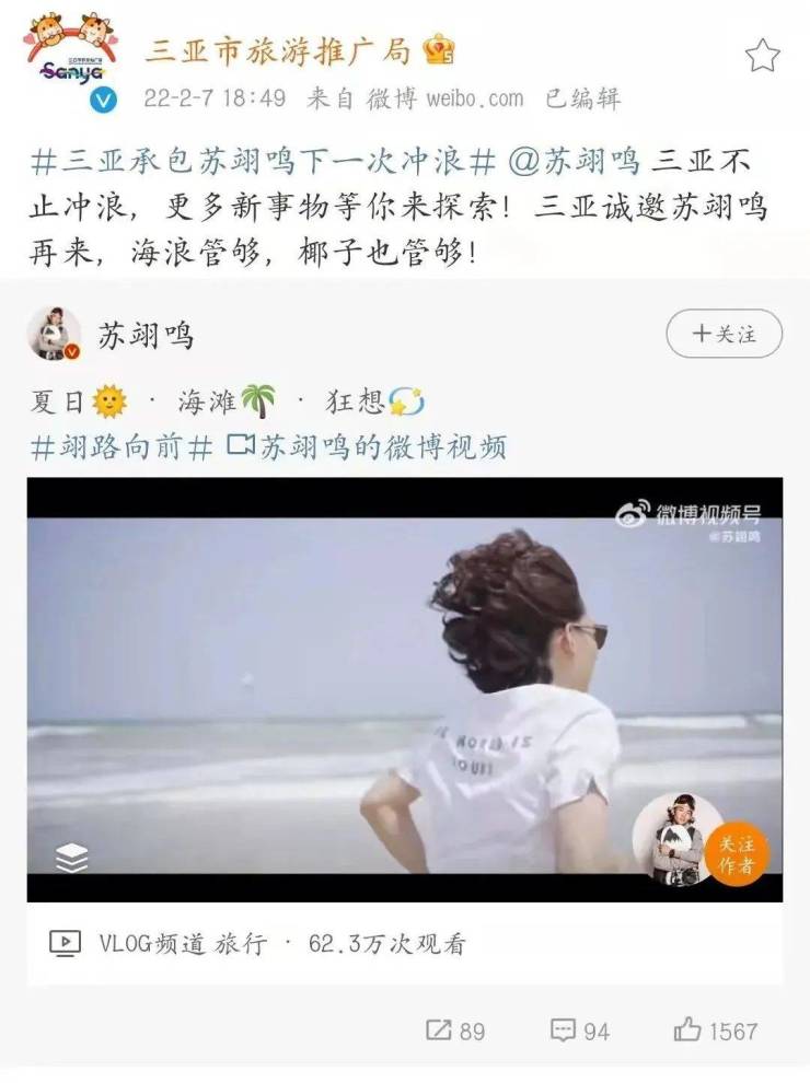 乘着冬奥的东风,三亚将体育旅游的城市名片打得响亮。冲浪、潜水、游艇、帆船成为主推的海上运动项目。2月,三亚市旅游推广局转发冬奥会冠军苏翊鸣冲浪的vlog并邀请其来三亚冲浪。