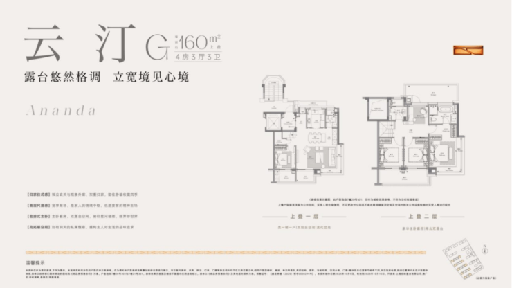 建面约160㎡上叠预计使用率最高约145%、约8.5m横厅双阳台双露台、南北通透主卧套房、阳光半坡顶楼。(注:非得房率,最终房屋得房率以实测报告为准)