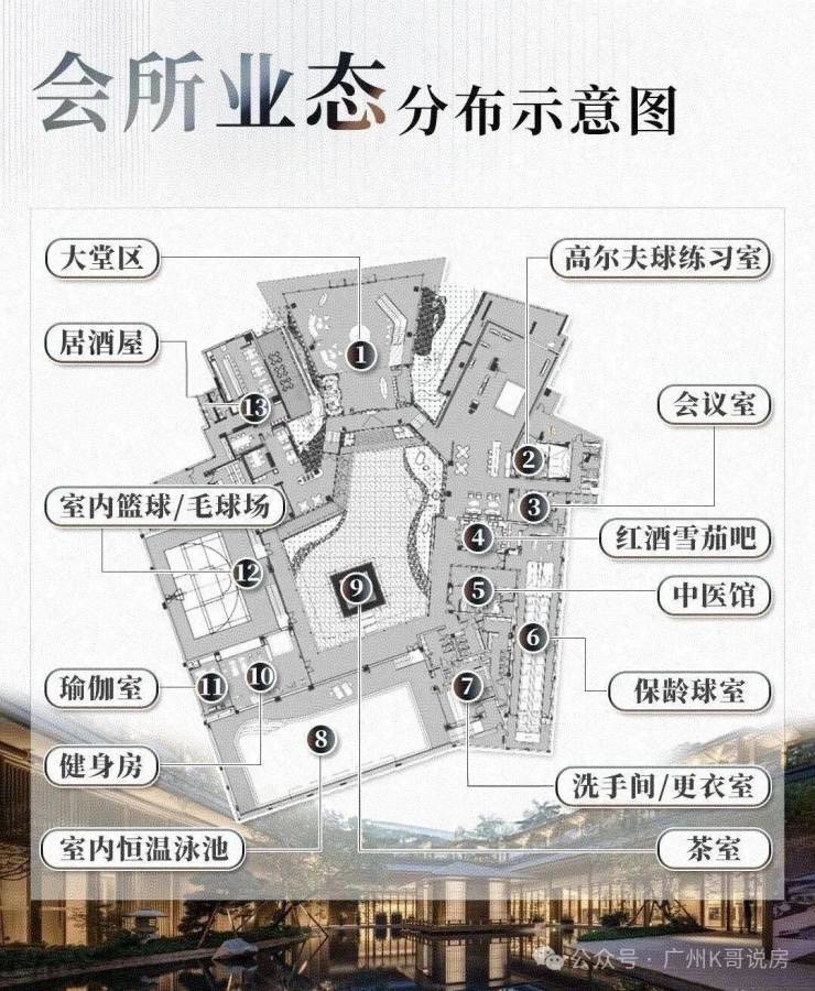 既有常见的恒温泳池、健身房、普拉提室,还有圈层专属配套,比如红酒雪茄吧、保龄球馆、室内篮球羽球混合馆、高尔夫练习室等,基本能满足日常所需。