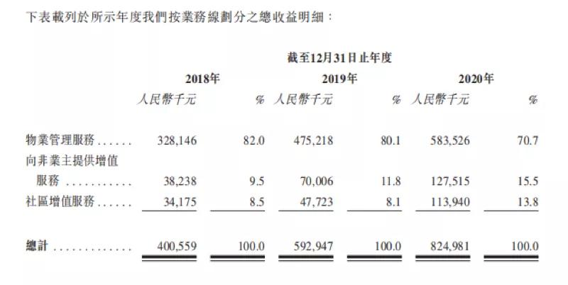 从具体业务细分来看,近年俊发服务也在拓展物业管理之外的增值服务。尤其是“非业主增值服务”与“社区增值服务”,2020年这两项业务营收占比已经分别提升至15.5%、13.8%。这其中,又以社区增值服务增速较快。