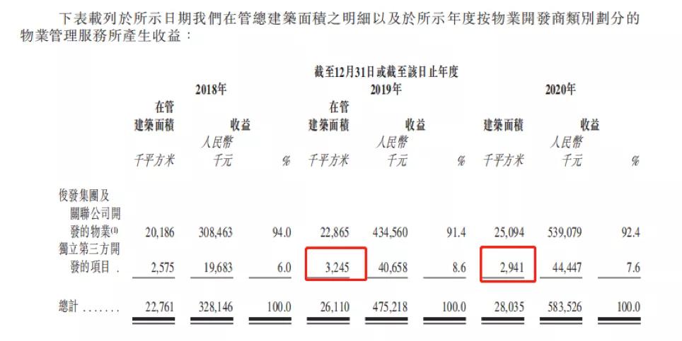 与此同时,俊发七彩服务在管独立第三方建筑面积出现了下滑,由2019年的325万平方米,降为294万平方米。