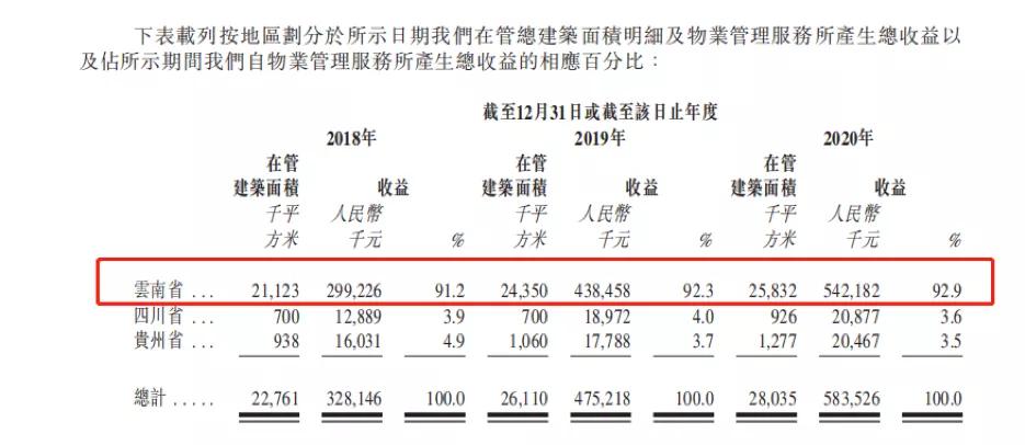 不难发现,俊发服务在管物业收益,对云南的依存度越来越高。除云南之外,四川与贵州只有小部分业务体量。