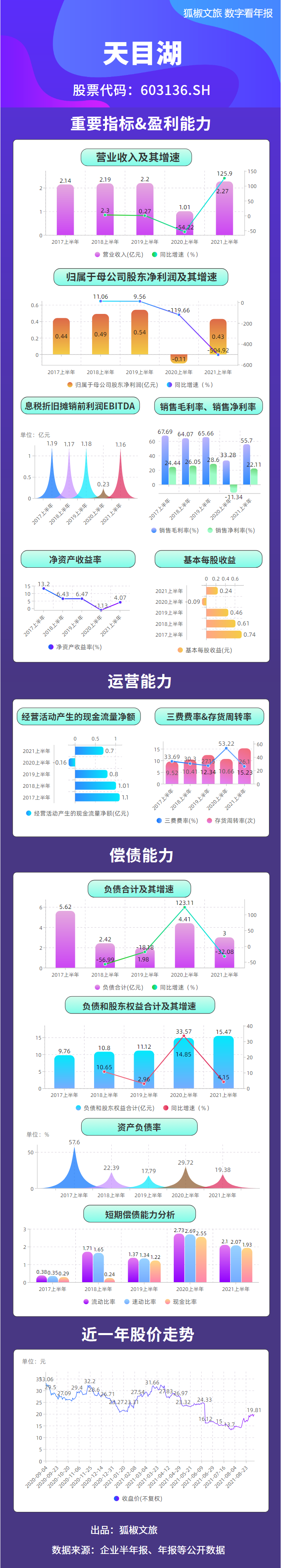 偿债能力方面,2017年至2021年同期,天目湖负债合计分别为5.62亿元、2.42亿元、1.98亿元、4.41亿元和3亿元;资产负债率19.38%,流动比率2.1%,短期偿债能力较强。