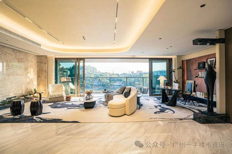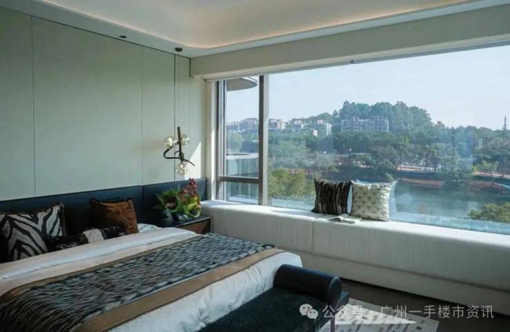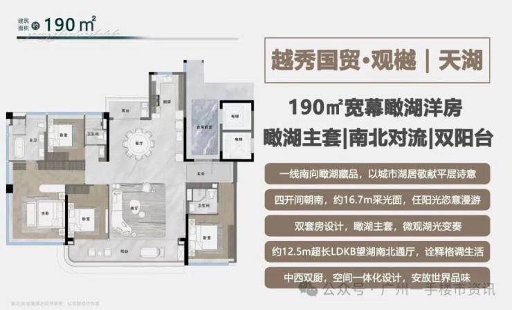 三期观樾天湖大平层产品做到了南北对流双阳台的户型设计,南向9.4米超长景观阳台的可一览太阳湖湖景,190㎡四房的空间布局有3个卧室都是可以南向看湖,三期大平层也是整个越秀观樾系列离湖边最近的豪宅产品。