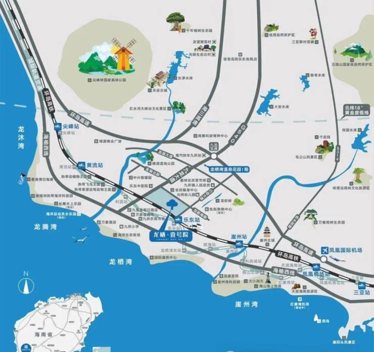 5、10分钟咫尺三亚:项目距海南环岛高铁站/轻轨站(预计2023年6月底建成通车)仅约500米,高铁乐东站到崖州站约10分钟,到三亚站约20分钟,抵达凤凰机场只需19分钟;5分钟至海南(G98)环岛高速,海三高速直通三亚。