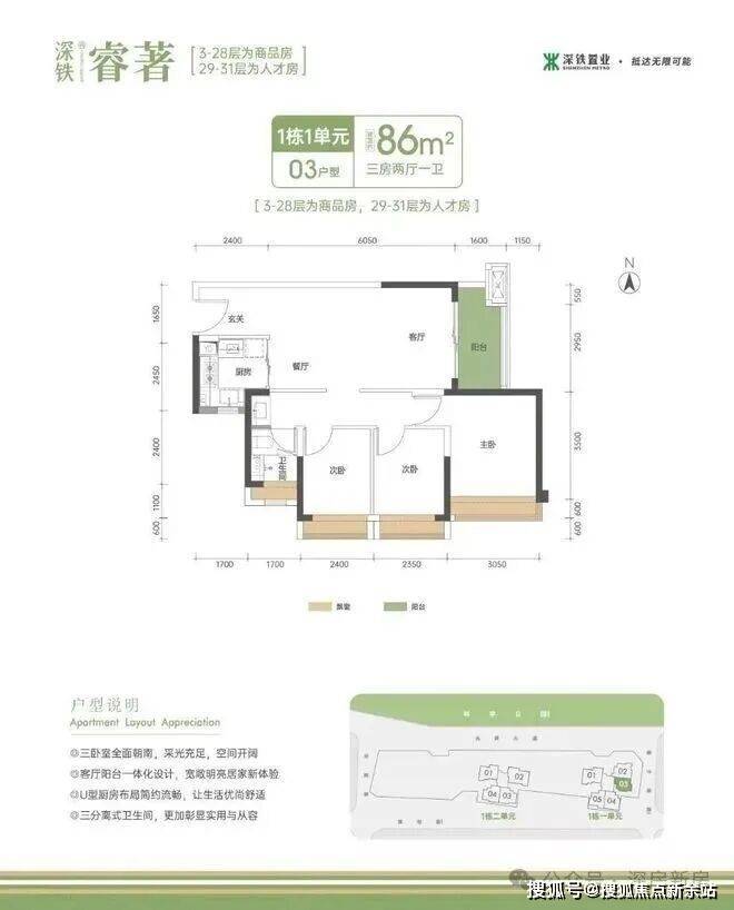 最新消息:光明中心区住宅新盘——深铁睿著广场已于2025年12月20日开盘选房。本次开盘共推出了228套商品房,1栋1、2单元,31层,2T4-5户,户型86-141㎡3-4房。备案均价4.3万带精装。同时取证的还有32套安居型商品房,88平29套,位于1栋1单元05户型;86平3套,位于1栋1单元03户型的29-31层,均价约2.5万,总价213万起,关于什么时候交楼?合同约定在2027年3月份带精装交房。