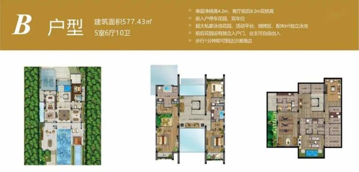 5室6厅10卫;地上二层,地下一层;单层净挑高4.2m,客厅前后8.2m双挑高;带有电梯预留井;前入户停车花园,双车位;超大私家泳池花园,活动平台、烧烤区、配128㎡独立泳池;前后花园设有独立入户门,业主可自由出入。步行1分钟即可到达沙滩海边。