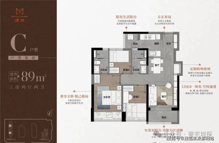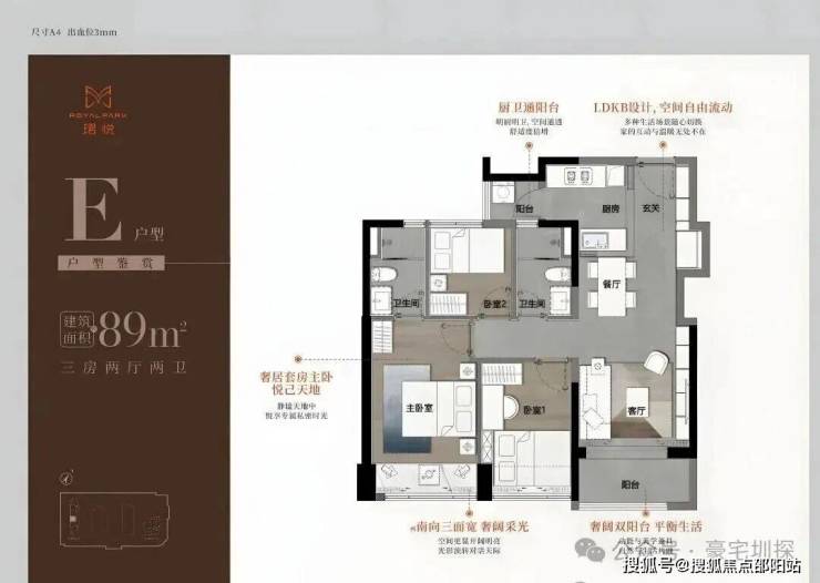 89㎡三房二卫A/B户型,位于1栋一单元,两开间阳台,主卧都有双面凸窗赠送。
