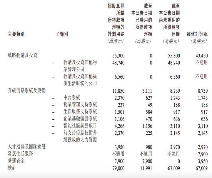 据悉,经扣除上市相关的包销佣金及其他估计开支,新希望服务所得款项净额(包括行使部分超额配股权)约为790.0百万港元。于2022年5月24日,董事会决议更改所得款项淨额的拟定用途,包括合并“战略收购及投资”主要类别的两个子类别的范围,调低“战略收购及投资”所得款项净额的比例;提高所得款项淨额“营运资金”的占比;“发展生活服务”所得款项淨额的全新分配。