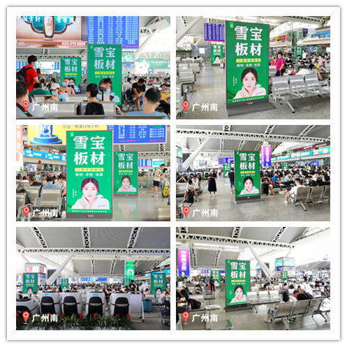 高铁以“国家新名片”的国家高度为品牌传播背书,为品牌形象带来无以伦比的附加值,是品牌传播的制高点,具有不可替代性,少有性,排他性,传播到达率 100%。雪宝板材以强势之姿打出华南区域高铁站群广告冲击波,代表行业品牌高端形象,让品牌直接触达目标人群,实现品牌强有力的曝光。