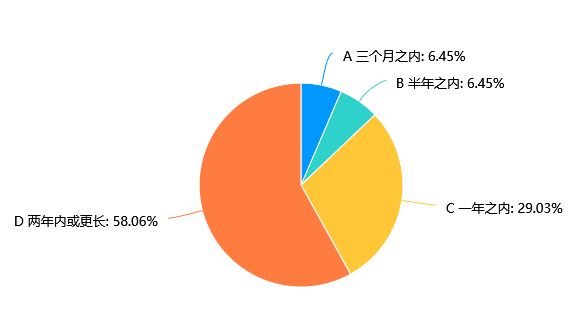 而在购房(或再次)置业的时间上看,样本中58.06%的网友选择“两年内或更长”时间,29.0%的网友选择1年之内,12.9%的网友选择半年内。