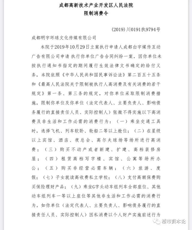 另外,值得一提的是张微在担任法人代表和执行董事兼总经理的明宇环球文化公司期间,因欠供应商款17万元不执行被法院开具限制消费令。