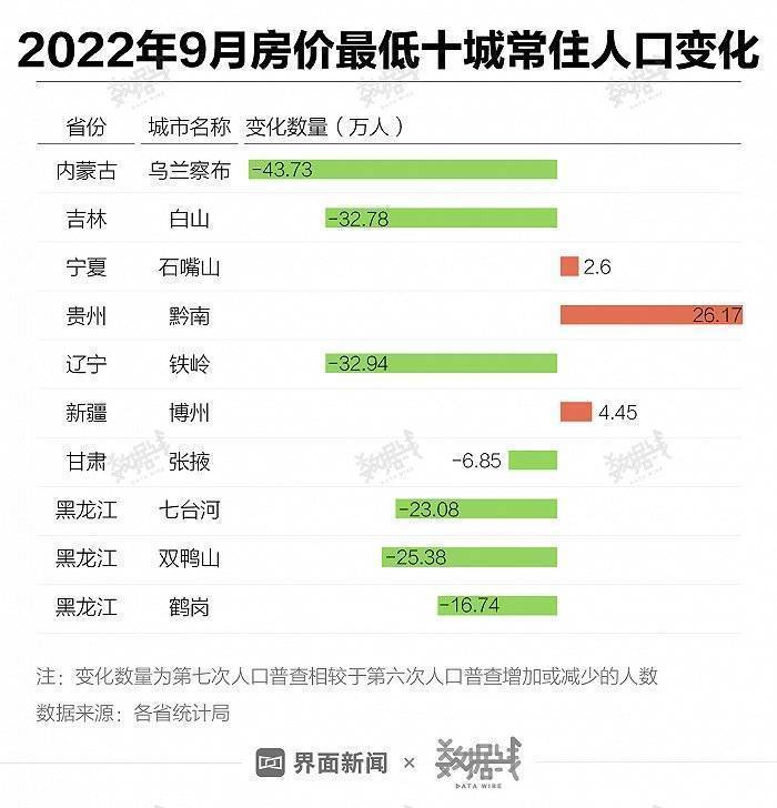 从常住人口角度来看,房价排名靠后的10个城市里就有7个城市,常住人口在第七次人口普查时出现大幅减少。相较于第六次人口普查,乌兰察布常住人口减少43.73万人,黔南常住人口则增加了26.17万人。鹤岗、双鸭山、七台河等地常住人口均呈下降趋势。