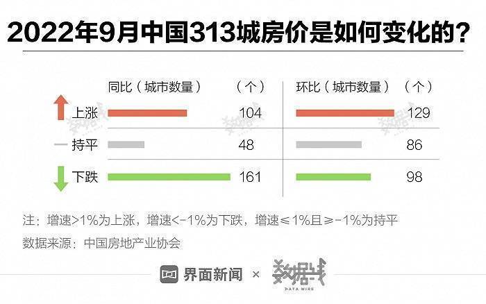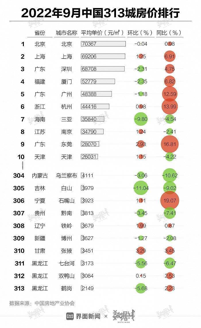 2022年9月,在纳入统计的全国313城中,有半数以上城市房价与去年同期相比出现下跌,全国房价增速平均值为同比下降1.01%。在每平米房价低于5000元的52个城市中,有24个城市的同比增速低于全国平均值。