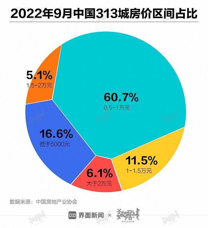 据界面数据统计,在纳入统计的全国313个城市中,有近八成的城市房价每平米低于1万元,每平米价格在2万元以上的城市仅占比6%。具体来看,每平米房价在0.5-1万元区间的城市数量最多,有190个城市,占比为60.7%;每平米房价低于5000元的城市数量有52个,占比为16.6%,排在第二位。