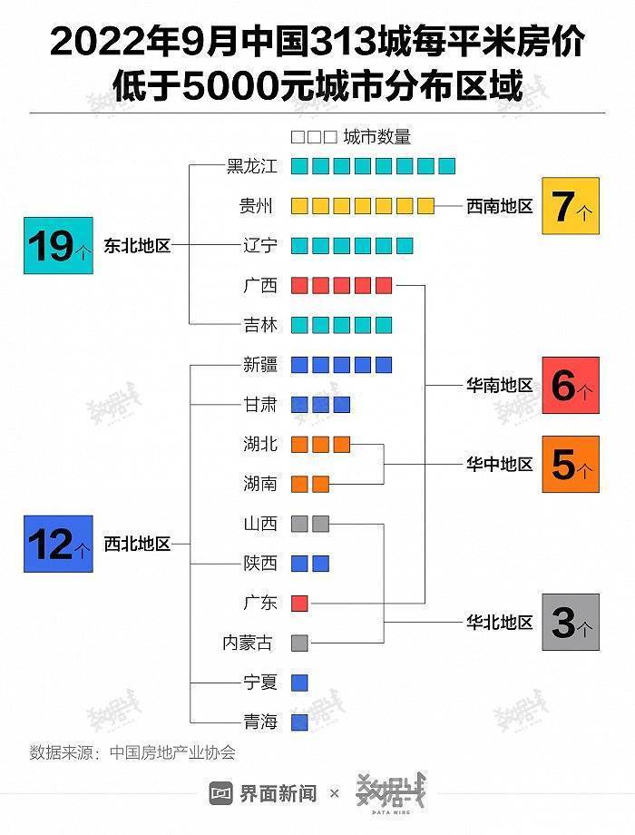据界面数据统计,每平米房价低于5000元的52个城市大多分布在我国东北、西北地区,分别有19个城市、12个城市。具体来看,主要集中在黑龙江、贵州、辽宁等省份,其中,全国房价较低的3个城市均位于黑龙江,整个西南地区仅贵州的房价在5000元以下。