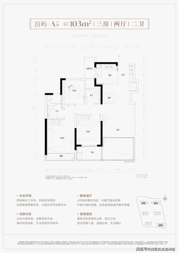 建面约103平,三房两厅两卫。三大亮点分析:① 南向三开间,朝南次卧带阳台,客厅联通阳台后,空间阔绰;② U型厨房且半开放设计,玄关含S墙冰箱位,利用率高、采光更优;③ 新规户型得房率高达约90%以上。