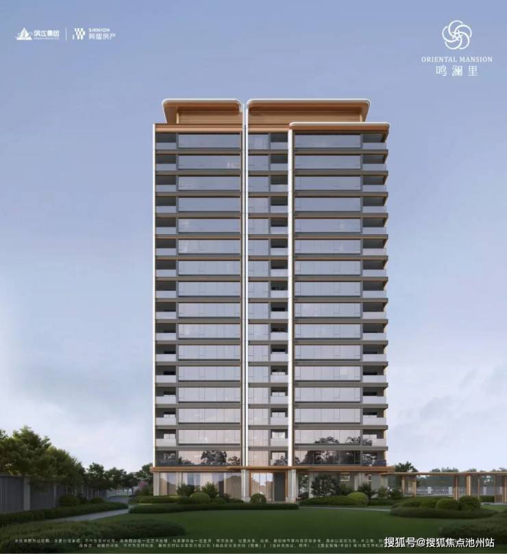 门前两棵罗汉松;园区内的中央园林围绕新型蓝宝石戏水池打造,营造澜韵迎宾、松鸣涧语、鸣泉叠韵、鸣芳拾趣、鸣香径幽等九境空间。