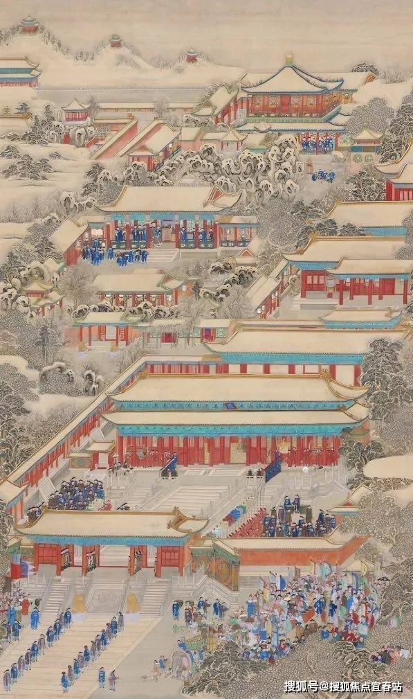 描绘了清乾隆年间万国使团来到紫禁城朝贡的宏大场景,上图为其局部画面,其中左侧布满假山的建筑群,即是乾隆花园。