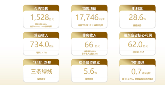 与此同时,世茂集团的营业收入也同比增长13.7%至734亿元;毛利则同比增长7.7%至210.1亿元;股东应占核心利润同比提升11.5%至62亿元;每股盈利同比增长16.7%至1.78元,盈利能力表现优秀。