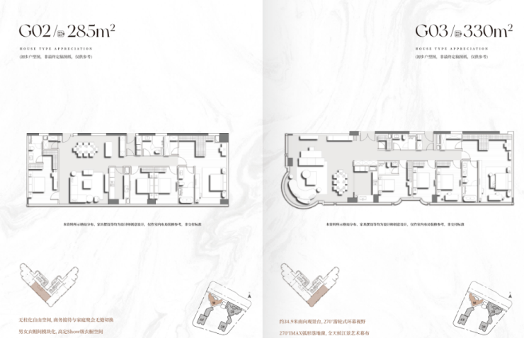 其中280㎡四房配备270°弧形观江客厅与全景落地窗,江面视野超1000米,直抵珠江入海口;