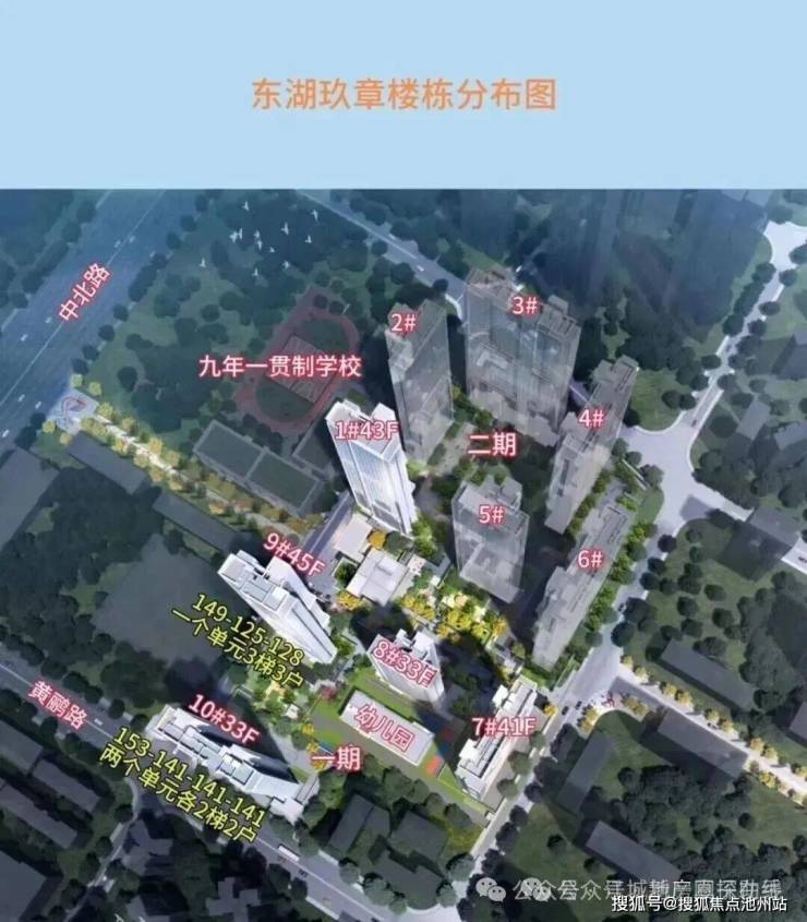 中海·东湖玖章共分两期开发项目总占地约53685㎡,建面约217000㎡,容积率约4.04,绿化率30%,总户数1353户,车位1755个,车位配比1:1.3,物业费3.2元/㎡·月,项目共规划了10栋33-45层,高层/超高层住宅分2期开发,地块需要配建一所九年一贯制学校、一所幼儿园。一期包含1、7、8、9、10号楼共622户,预计2026年6月30日精装交付;二期包含2、3、4、5、6号楼共731户,预计2026年11月30日精装交付。