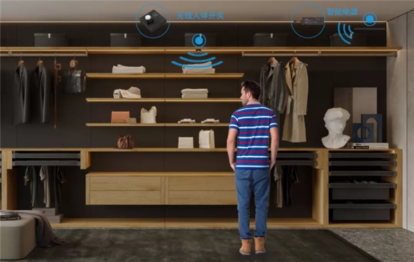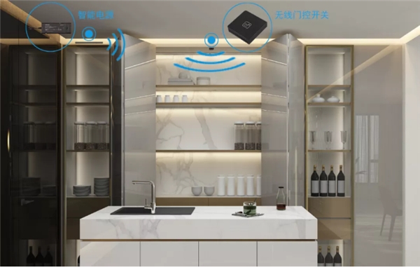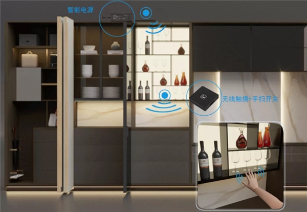 不仅如此,玛格无线电源开关系统还具备无线触摸+手扫开关、无线门控开关灯,比如把门控开关安装在餐边柜中,门档感应,自助照明,开门即亮,关门渐灭,节省电能消耗,拿取物品更便捷;而无线触摸+手扫开关,可安装在酒柜展示架中,作为补充照明,挥手一触即亮,非常实用。