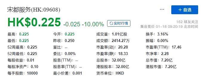1月18日,宋都服务在港上市,开盘报0.225港元/股,跌10%,总市值约7.20亿港元。