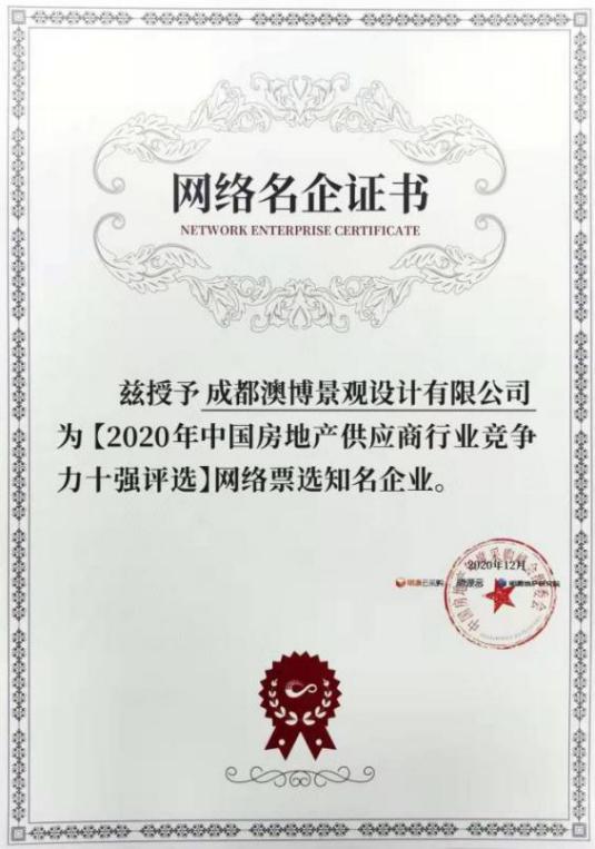 日前,由明源云、中城联采联合主办的“采购新价值,共筑新人居” 2020中国房地产年度采购峰会暨第五届标杆开发商及优秀供应商颁奖盛典在上海盛大召开。成都澳博景观设计有限公司(简称:澳博景观,英文缩写:AOBO LANDSPACE )澳博景观在众多品牌中脱颖而出,荣获“中国房地产供应商竞争力十强网络票选知名企业”的荣誉称号。
