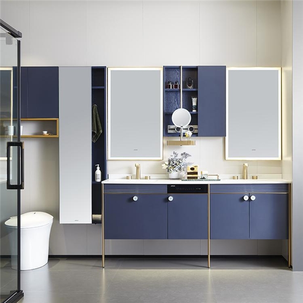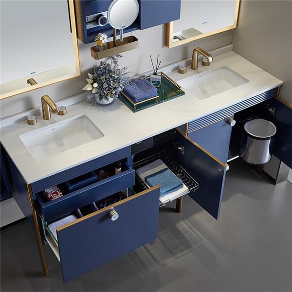 细节之处的设计是品质的彰显,双盆设计既大气美观又能同时满足两人使用,滚轮造型的把手拥有曲线美学,隐藏式的柜内垃圾桶确保了浴室柜整体的整洁度和整体性。时尚的颜值和考究的细节,轻松优雅一整个卫浴间。