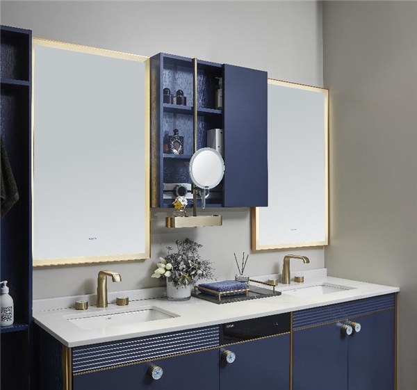 现今社会,高颜值是精致生活的其中一个重要因素,箭牌卫浴维娅定制浴室柜以深海蓝流行色作为主基调,时尚不失沉稳,搭配鱼肚白大理石台面,再以香槟金点缀其中,共同营造出优雅现代的空间氛围。