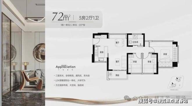 -72㎡的3房2厅1卫:设计的是竖厅南北通透格局,进门独立玄关,LDKB一体化,主卧270°飘窗设计,L型厨房,卫生间干湿分离,得房率约97%(包含赠送),阳台主朝东北向。