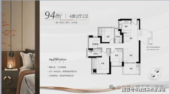 -94㎡的4房2厅2卫:设计的是竖厅格局,进门独立玄关,LDKB一体化,S墙设计预留冰箱卡槽位,主卧双飘窗设计,U型厨房,卫生间干湿分离,得房率约97%(包含赠送),东南朝向。