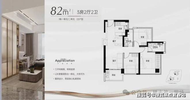 -82㎡的3房2厅2卫:03户型,设计的是竖厅格局,进门独立玄关,LDKB一体化,S墙设计预留冰箱卡槽位,主卧双飘窗设计,L型厨房,卫生间干湿分离,得房率约97%(包含赠送),西南朝向。