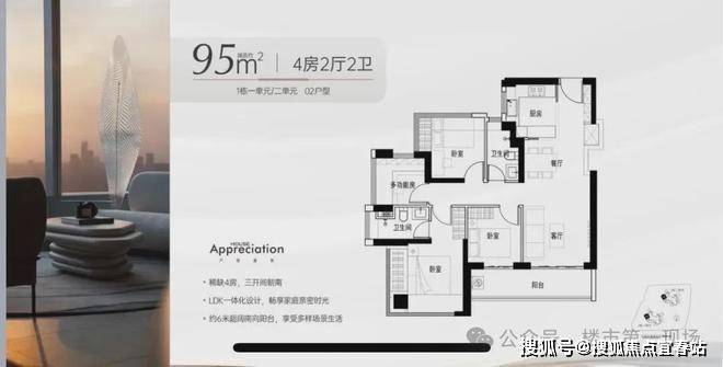 -95㎡的4房2厅2卫:设计的是竖厅格局,进门独立玄关,LDKB一体化,S墙设计预留冰箱卡槽位,主卧双飘窗设计,客厅连接次卧出6米长的大阳台,L型厨房,卫生间干湿分离,得房率约97%(包含赠送),西南朝向。