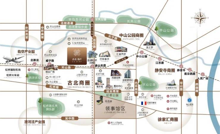 全球资源流向,跨越时代峰值,依托大虹桥,流向大古北,大虹桥开发区、长风公园商务区、,漕河泾开发区、临空产业区围合,生活于古北的名流,超50%皆为海外精英,国际化的符号,在时代翻涌的浪潮中永不褪色。