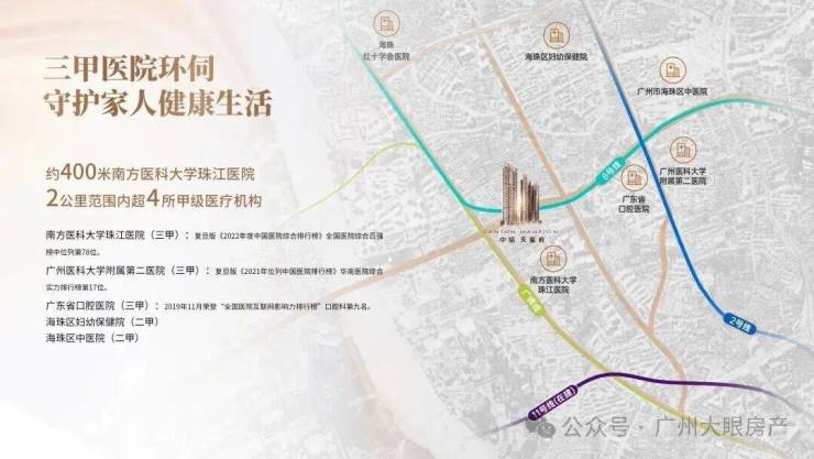 500米步行南方医科大学珠江医院,广州医科大学附属第二医院、广州市红十字会医院、广东省口腔医院等多家三甲医院保驾护航。