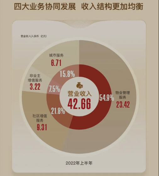 一个显著的表现是,2022上半年,随着在管项目的持续增加,世茂服务物业管理服务业务的收入达到了23.42亿元,同比增长16.3%,收入占比亦达到54.9%。